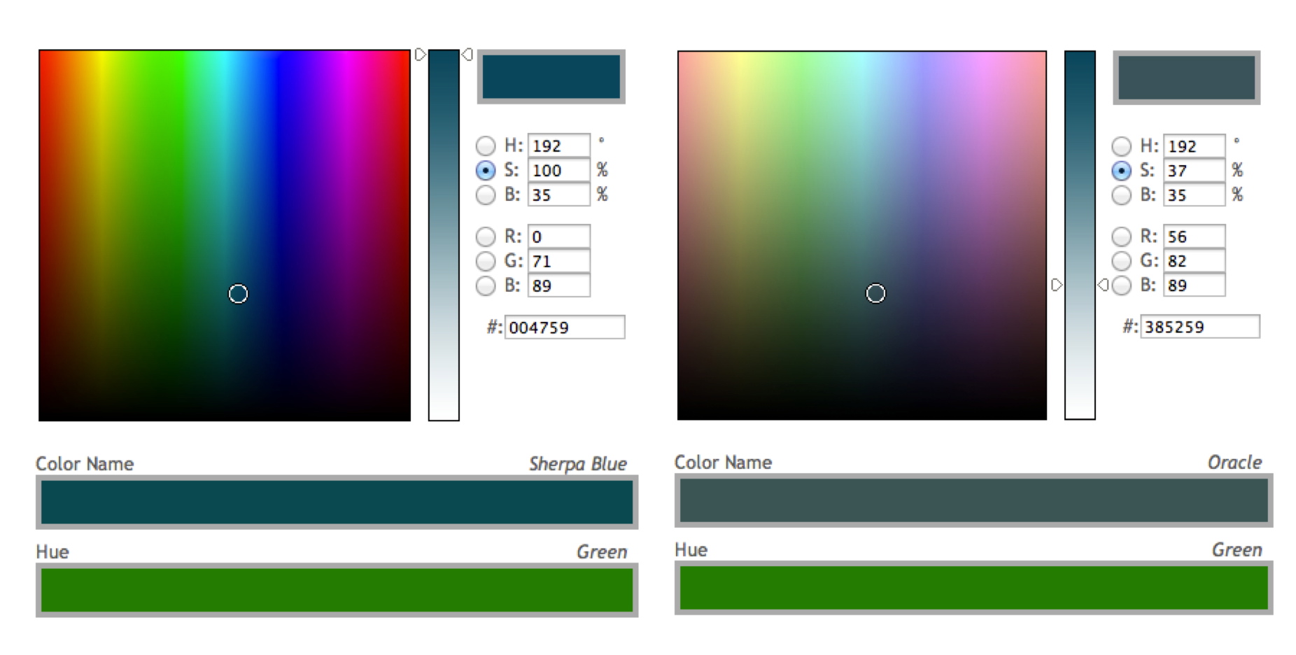 There’s also another site, and it’s in my top ten favorite websites: Color Name & Hue provides an interactive color wheel, and it’s also usable for people who are colorblind, because it provides descriptions. For instance, the picture below is of the website. I randomly clicked a space within the colors, and it provided the color “sherpa blue” beneath the hue “green.” The second picture shows the color after I shifted the bar on the right (opacity) which changed the color to “oracle” within the same shade “green” since the mouse never moved.