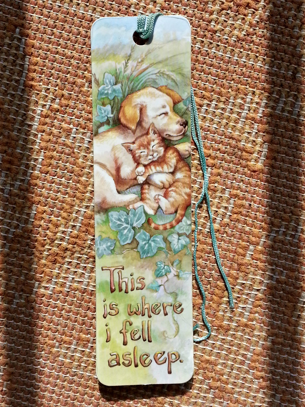 asleep“This is where i fell asleep” is my oldest bookmark. It was my favorite when I was a kid. I believe I read all of the Dear America books and the Magic Tree House series with this bookmark slid in the pages. I even remember getting it at a book fair. (I think they were cheaper because of the grammatical error, but I’m not sure? I think the i” was definitely on purpose and probably didn’t go over well with parents.) ANYWAY – I loved animals, so this was perfect for me. It used to even have a little puppy attached to the top, but that didn’t last for very long [obviously]. I don’t use it anymore, but it sits on my shelf of accomplishments. (Yes, I have something as egotistical as a shelf of accomplishments ::sigh:: It’s how I stay motivated.) But this bookmark reminds me of childhood and how I lost myself and found myself in novels, whether it was my first You Choose the Story Scooby Doo books, Goosebumps, or The Journal of Scott Pendalton Collins: A World War 2 Soldier. (My favorite Dear America book.) This bookmark is a memory because this bookmark represents my childhood love for novels that continued into my adult life.