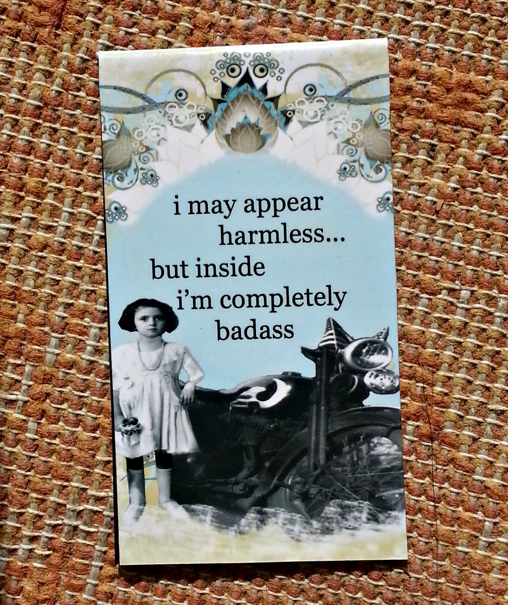badass“i may appear harmless…but inside i’m completely badass” This is my current bookmark, and I love it so much. (And I also just realized the I have a thing for “i” being lowercased.) This bookmark was a gift I received from a wonderfully talented painter, and it brings a smile to my face anytime I open a book and read the words. Just as a friend does, it makes me laugh, smile, and enjoy the time ahead (in this case, a novel.) Also, who couldn’t love the phrase? If you still need coaxing, it’s a magnetic bookmark – so it never falls out. This is good for clumsy readers such as myself. And – once again – like a friend, it is prepared more than I am. It knows I’m clumsy, even before I remember I am. The fact that it is also a gift reminds me of how much a gift can warm a heart up, no matter how small it is. This bookmark is a friend because this bookmark reminds me of laughter and staying true to myself.