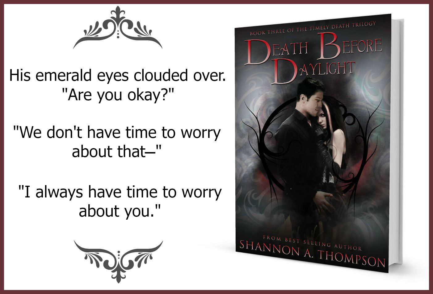Death Before Daylight, book 3 of The Timely Death Trilogy, releases in six days! That being said, the paperback has been moved to October 19, but I hope you all enjoy the last book of the trilogy! You can pre-order it here: Amazon, Barnes & Noble, iBooks. (And, of course, the first book is free: Amazon, Barnes & Noble, iBooks.)